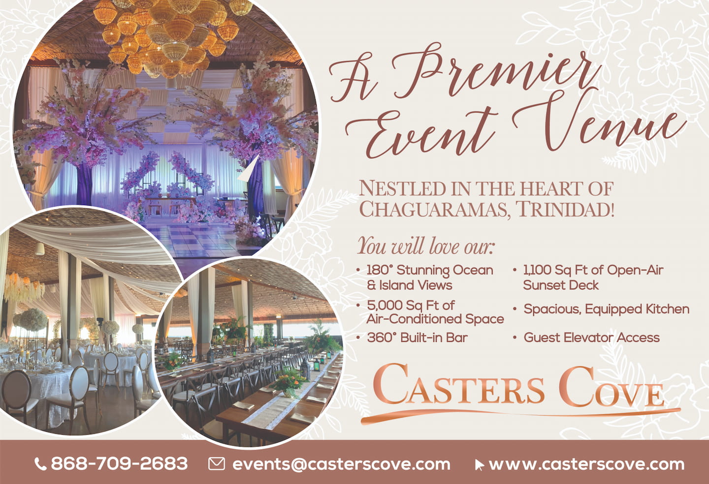 Casters Cove offers our local clientele, the Trinidad & Tobago event industry, the wider Caribbean region and the Caribbean diaspora a state-of-the-art, fully air-conditioned, fully-equipped space for events of all kinds, providing all of the comforts, amenities and beauty of an indoor event venue, while still being immersed in nature and offering amazing island views at every turn!